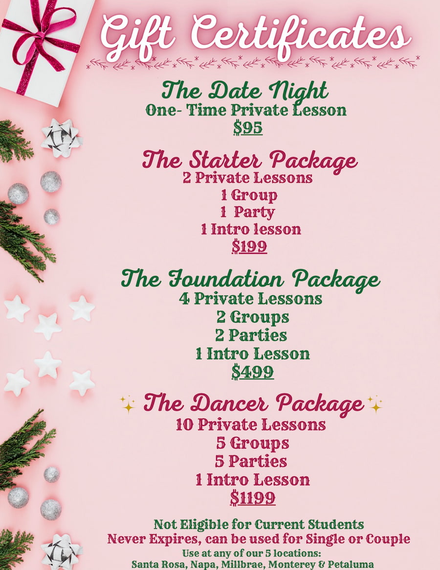 We teach any dance you can dance with a partner: Waltz, Swing, or Cha Cha? You got it. Salsa, Tango, Two-Step? No Problem! With over 30 styles of dance to choose from, we've got you covered.